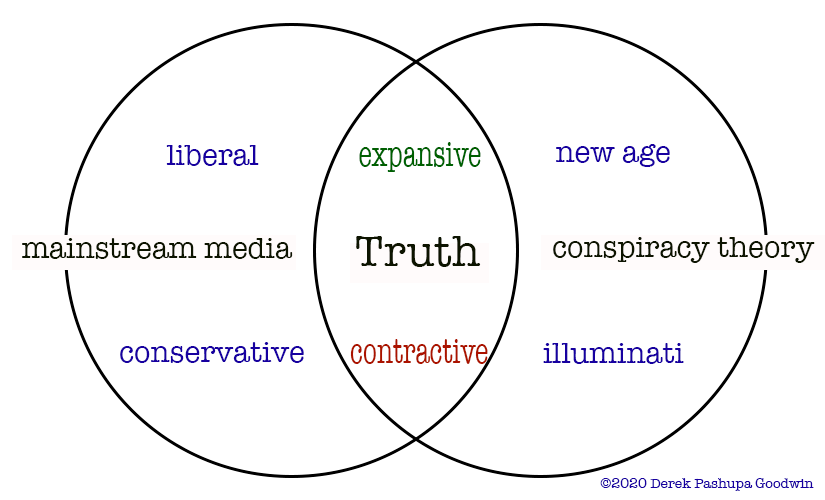 Within the overall expansive nature of conspiracy, there are subsets of expansion and contraction. The liberal-leaning tribes tend to go with new age explanations, which push us out towards the cosmic. The conservative-leaning folks are attracted to beliefs in secret cabals and lizard people, intermingling racist interpretations that draw us into a paranoid worldview.
