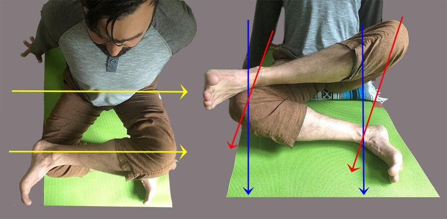Blue arrows - The plumb line. In this pose, the ankles and knees are stacked in a plumb line. Even if our hips are too tight to allow the opposing ankles and knees to touch, an imaginary line dropped from above should go straight through both of them.