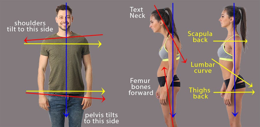 The two photos of the woman show how we can become misaligned through laziness. Our smart phones and other devices have brought the term text neck into our lexicon. For every inch that your head sits forward, it increases the weight of the head by approximately 10 lbs! It can cause everything from headaches to thoracic kyphosis and spinal degeneration.