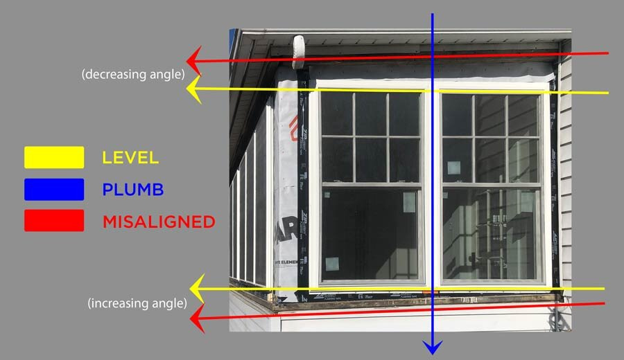 The window in this photo was part of my first carpentry remodeling job, installing new windows on a porch. We are looking at a side view of the porch, which is connected to the main structure of the house, on the right. The porch has settled over time. You can see the red arrows pointing in a downward angle to the left, in line with the original framing. The yellow arrows show where we built new level framing and installed the windows. Because those lines are level, the windows are vertically aligned with the blue plumb line. All is squared at 90º angles.