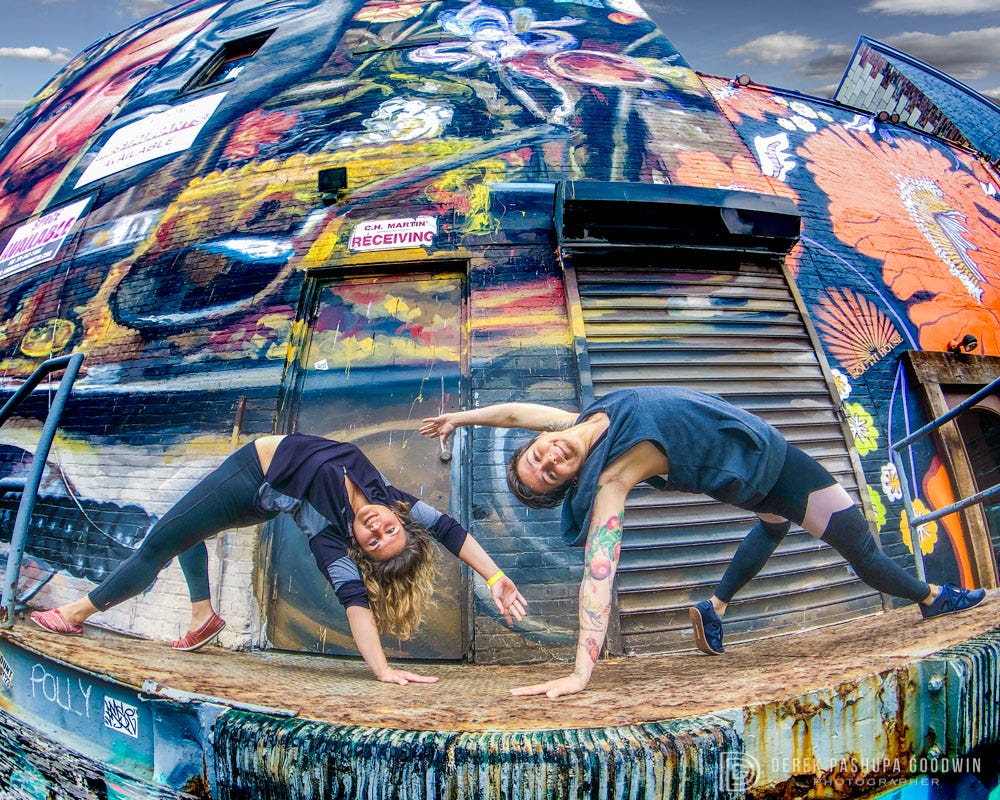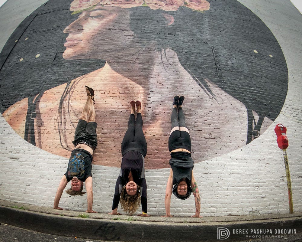 I took my fellow Jivamukti Yoga teachers Katherine Szekely and Jessica Stickler for a photo shoot with the beautiful murals that grace the walls of downtown Jersey City. I have professional-quality lenses for my iPhone 8 with the Moment system, and set it up to do this handstand selfie of the 3 of us.